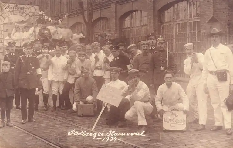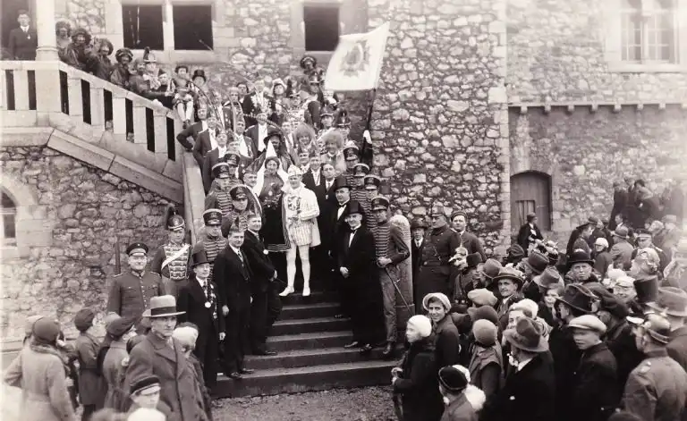 Das Jahr 1934 sah für den 14. Januar bereits eine große Gala-Damensitzung im Hotel Scheufen vor, die etwas ganz besonderes bieten sollte. Seit zwei Jahren hatte man die Kölner Prinzengarde eingeladen, doch machten Terminschwierigkeiten ihr Erscheinen immer wieder unmöglich. Nun endlich war es gelungen, die große Bruderschaft aus der Rheinmetropole zu der oben erwähnten Sitzung in Stolberg erwarten zu können. Allerdings gab es einen kleinen Schreck, indem die Gäste sich mit 40 Herren und 15 Tambouren anmeldeten. Die Bühnenverhältnisse in den Scheufen’schen Sälen reichten für eine derartige „Invasion“ kaum aus, zumal die Sitzung bis auf den letzten Platz ausverkauft war. Ein Teil der Gäste mußte daher im Nebensaal untergebracht werden. Das wurde den Kölnern mitgeteilt und sie sagten trotzdem zu. Am Mühlener Markt holte man die Kölner Freunde, die vom Hauptbahnhof mit 3 Straßenbahnwagen eintrafen, ab und geleitete Sie im Zuge mit Musik zum Veranstaltungshaus. Es trat an diesem Abend u.a. auf der berühmte Star Gustav Jacoby mit seiner Zigarre. Auch Fräulein Margret Schleicher (Burg Bleibtreu) bot einen eleganten Bühnentanz. Sowohl die Kölner als auch die AKVer bedankten sich später nochmals schriftlich für den prächtigen Abend und die schönen Stunden in Stolberg. Am 27. Januar fand die Proklamation von Hans I. im Hotel Scheufen statt. Tollität schwang das Zepter mit viel Erfolg und erntete durch seine charmante und liebenswürdige Art großen Beifall. Die Baufirma Robert Grünzig hatte die Kemenate der Burg für einen romantischen Prinzenempfang provisorisch hergerichtet.