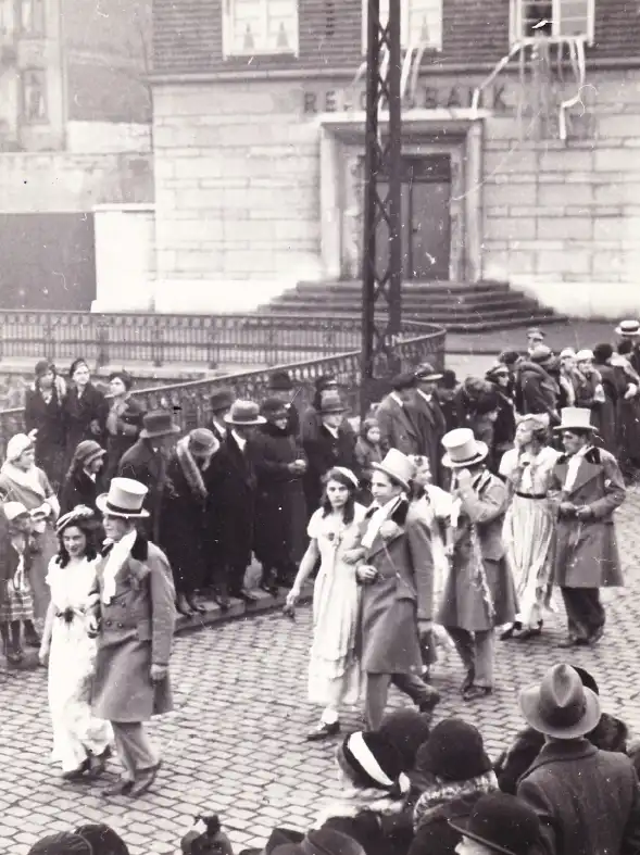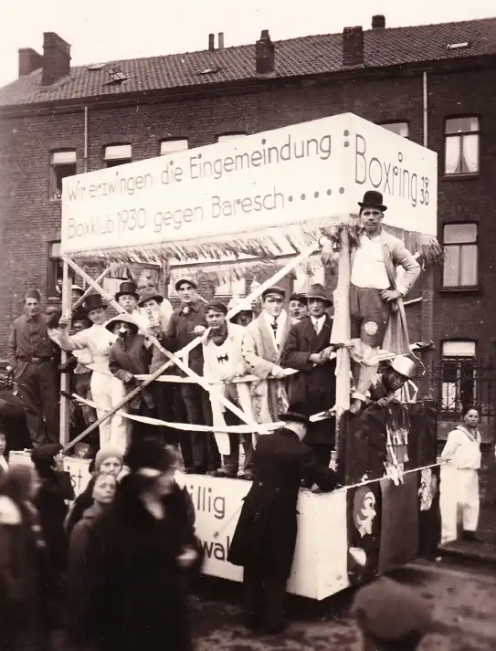Rosenmontagszugteilnehmer vor der Kartonagefabrik Prym, Zweifaller Straße